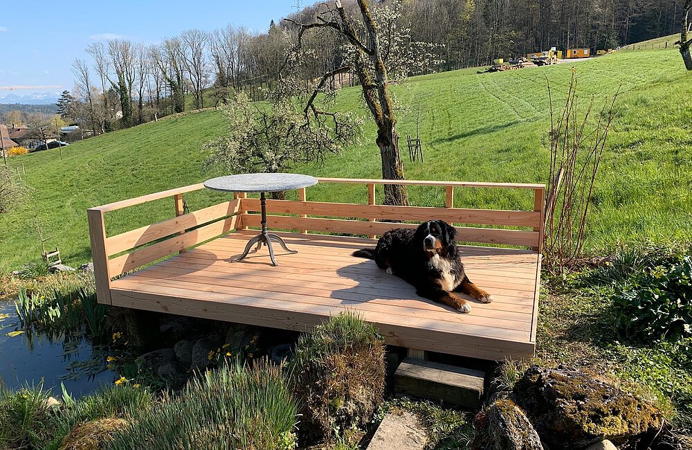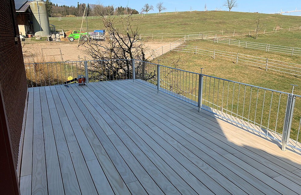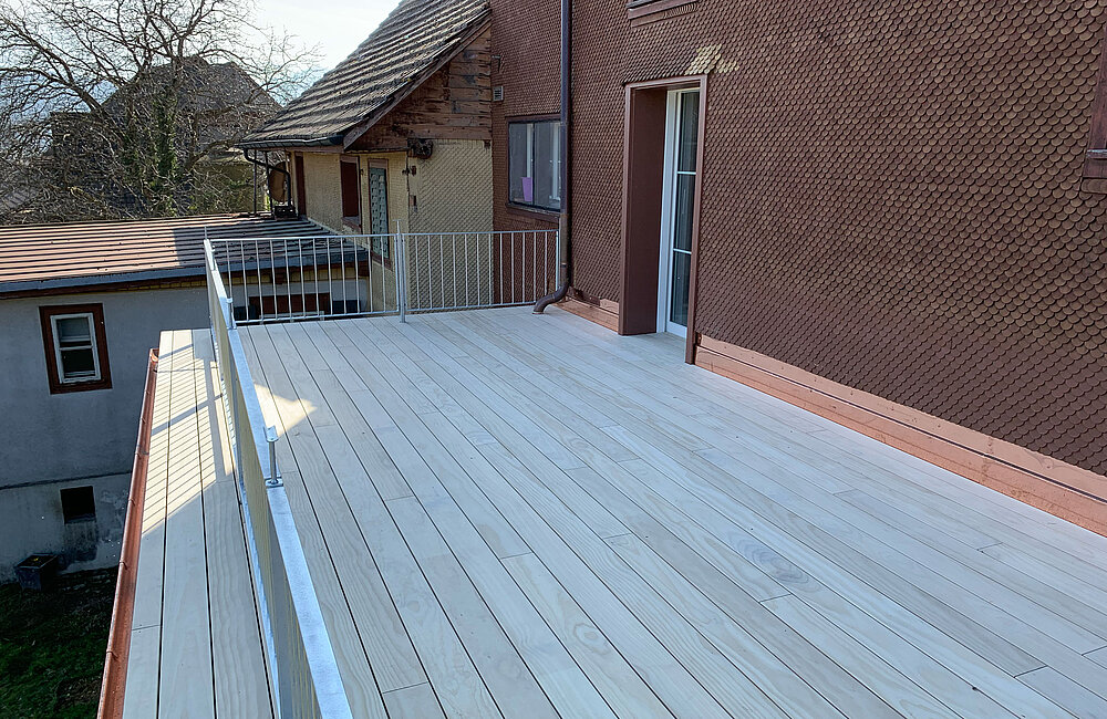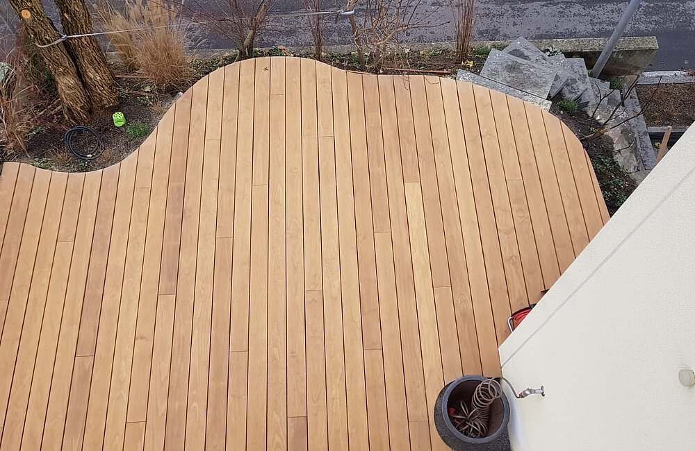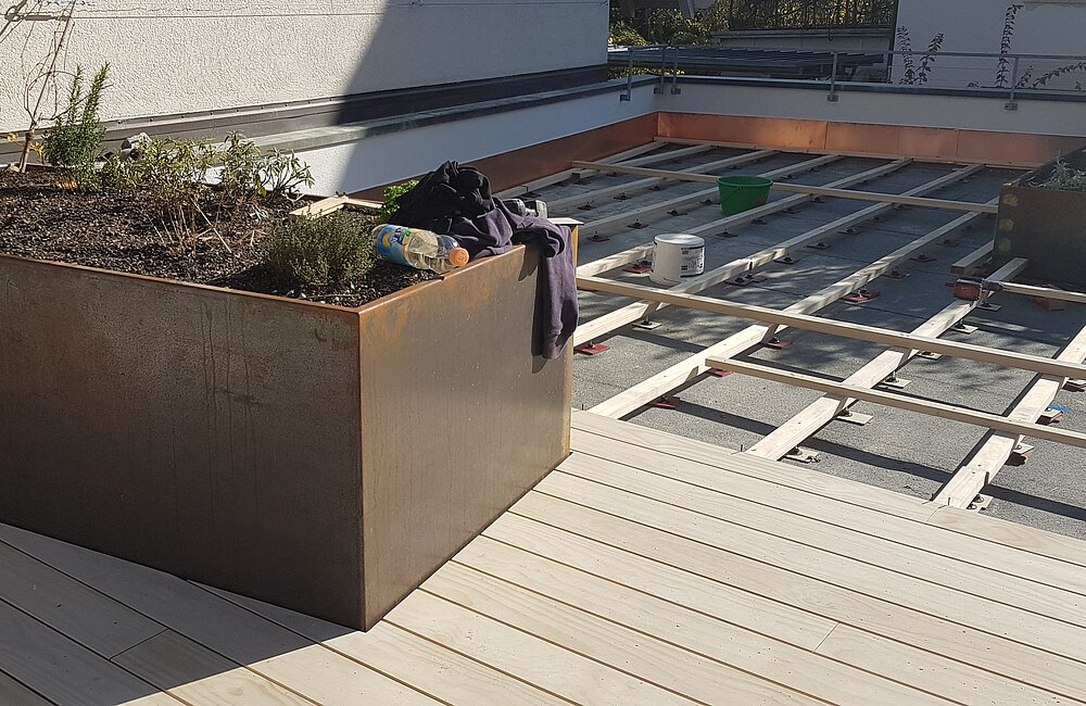 Ein hochwertiges Holz-Terrassendeck verbindet Wohnraum, Flachdachterrasse oder Garten auf natürliche Weise. Holz als Bodenbelag schafft ein angenehmes Klima – es bleibt im Sommer kühl und speichert im Winter keine Kälte. Zudem wirkt es harmonisierend auf die Sinne und verleiht Ihrer Terrasse eine warme, einladende Atmosphäre.